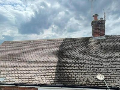Once the roof moss has been removed, We typically apply a Biocide soft washing solution to the roof to ensure the roof continues to clean itself long after the job has been completed, This prevents the moss returning for much longer than typical cleaning methods. We only use credited biocide either GKpro biocide or Algo Clear Pro biocide.
